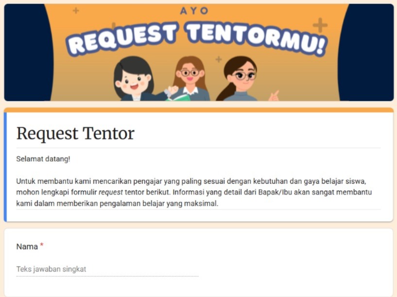 Apabila kebutuhan pembelajaran bersifat spesifik—misalnya membutuhkan tentor dengan kualifikasi tertentu, pengalaman khusus, metode pengajaran tertentu, atau kebutuhan pendampingan khusus—calon siswa atau orang tua dapat mengajukan permintaan tentor khusus melalui formulir yang telah disediakan. Tim GoTentor akan melakukan proses kurasi dan merekomendasikan tentor yang paling sesuai dengan kebutuhan tersebut.